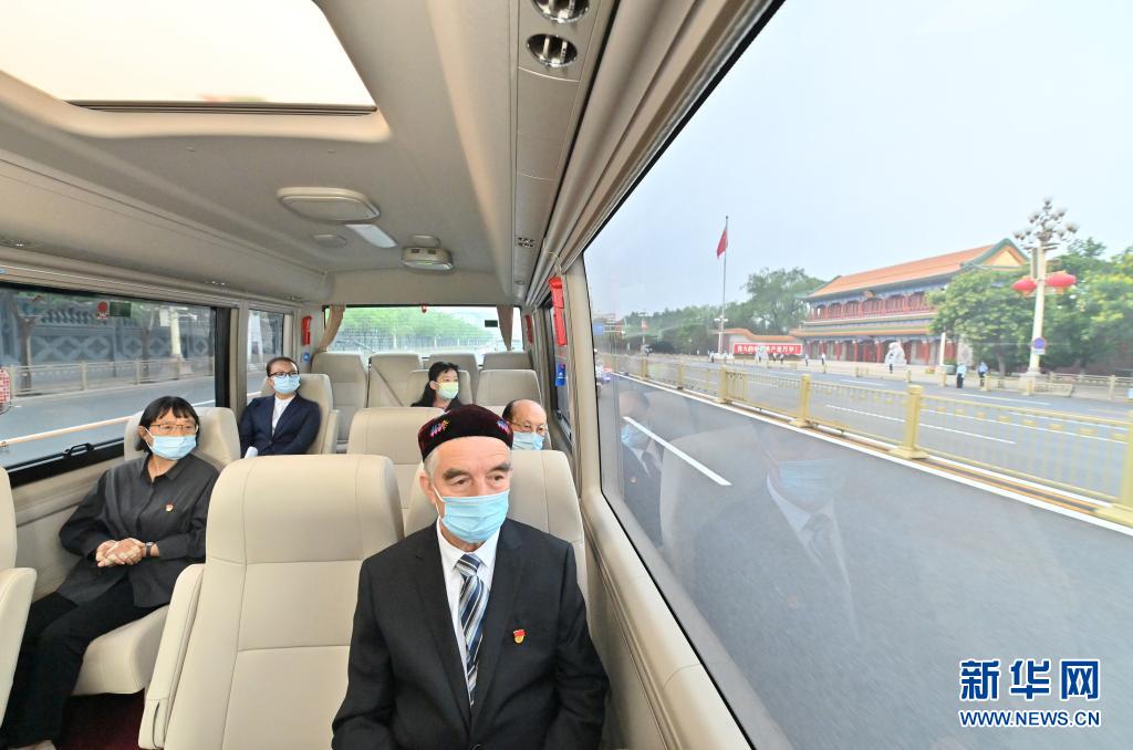 這是買(mǎi)買(mǎi)提江·吾買(mǎi)爾(前)、張桂梅(左一)、吳天一(右一)乘車(chē)前往人民大會(huì)堂。