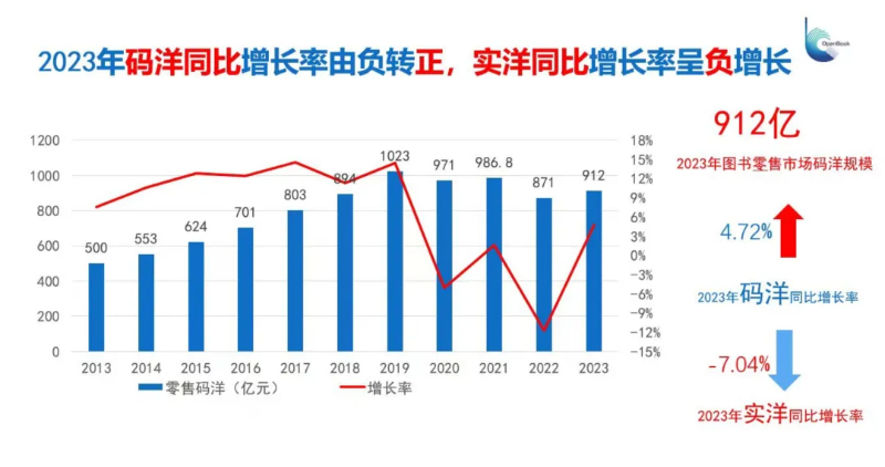 开卷数据显示,我国图书零售市场规模(码洋)从2013年的500亿元发展到2023年的912亿元,年均增速超5%,实现了平稳发展。