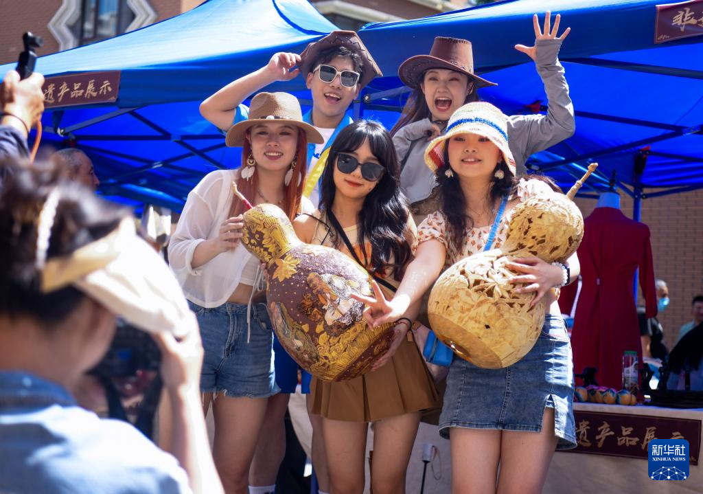 6月9日,在乌鲁木齐大巴扎景区,几位来自武汉的游客手持葫芦雕刻作品合影留念。