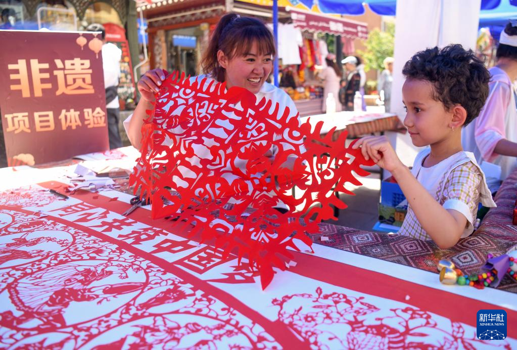 6月9日,在乌鲁木齐大巴扎景区,一名小朋友在活动现场体验剪纸。