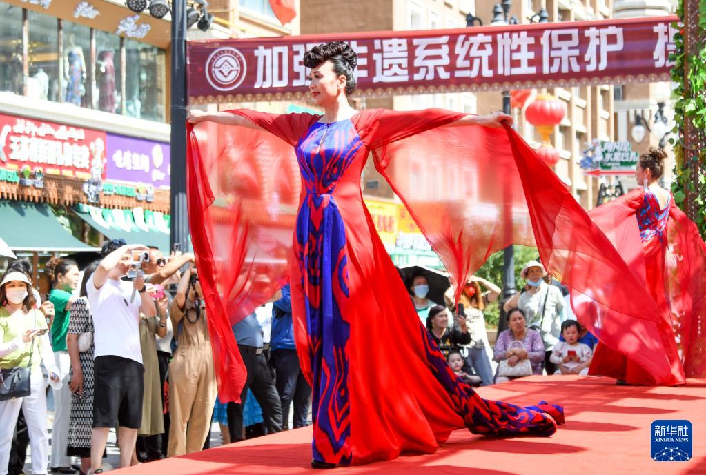 6月9日,在乌鲁木齐大巴扎景区,模特在活动现场展示艾德莱斯绸制作的时装。