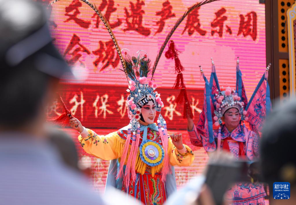 6月9日,在乌鲁木齐大巴扎景区,乌鲁木齐市文化馆群星京剧团的演员表演京剧《国粹芬芳》。