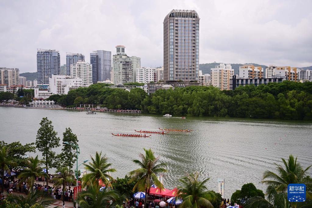 6月18日,龙舟队在海南省三亚市三亚河上进行比赛。