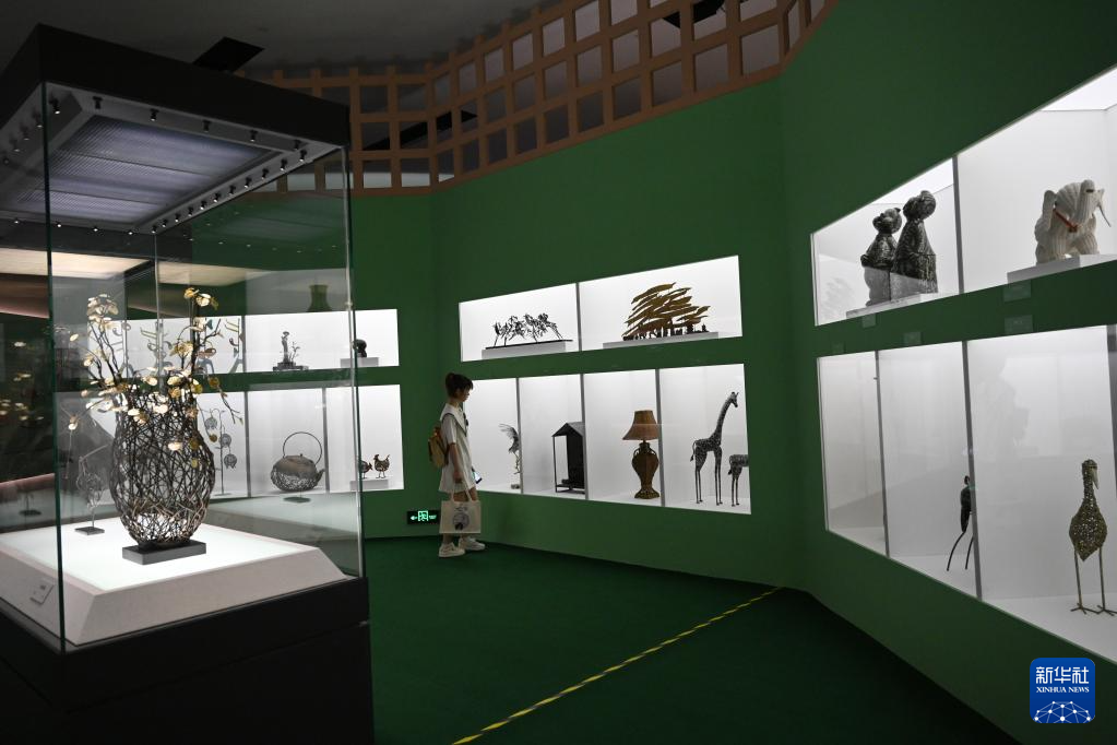 6月20日,竹编艺人陈红萍在展览现场介绍安溪的竹编工艺品。