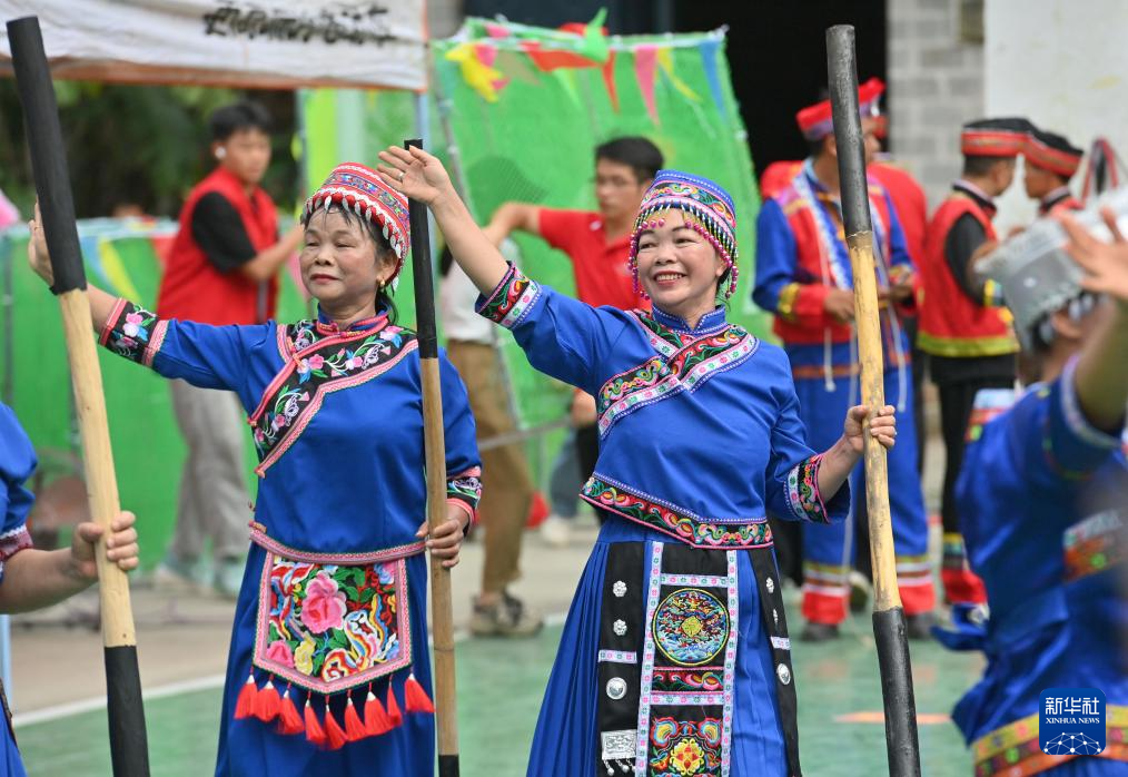 7月11日,在大化瑶族自治县仁良村,村民跳糍粑舞。