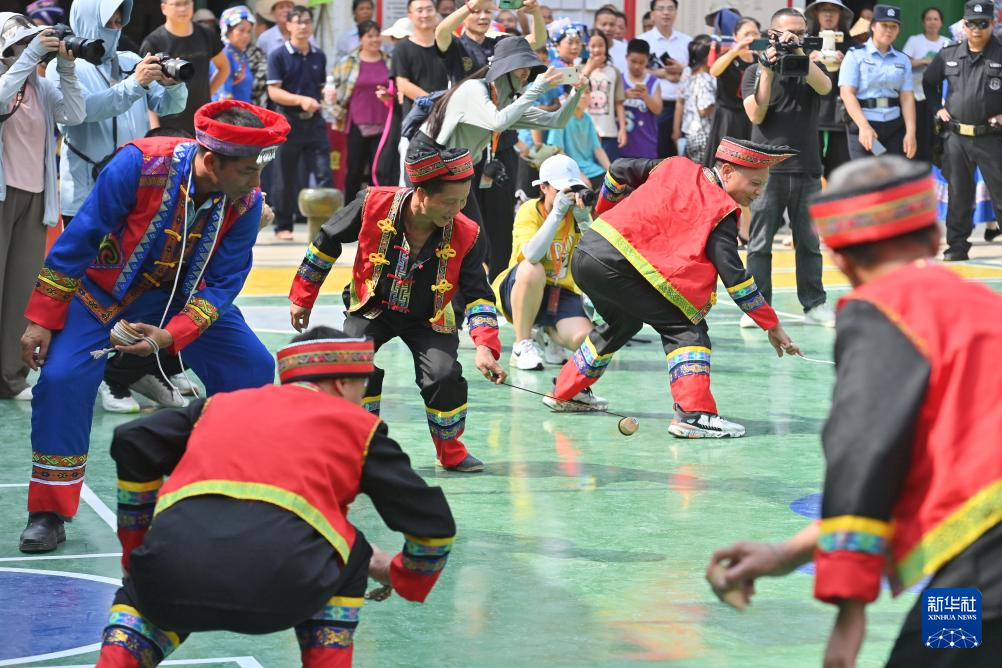 当日,广西大化瑶族自治县的各族群众欢聚一堂,通过打陀螺、跳民族舞蹈、射弩等丰富多彩的民间文娱活动,欢庆一年一度的传统节日——“祝著节”。