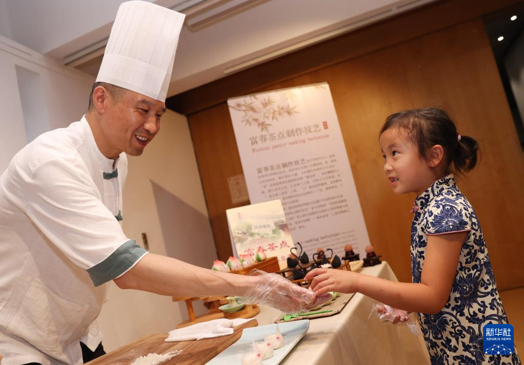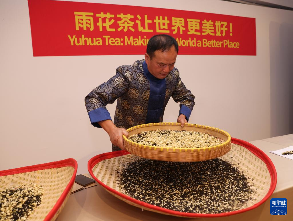 7月11日,在位于法国巴黎的联合国教科文组织总部,南京雨花茶传承人陈盛峰演示制作雨花茶。