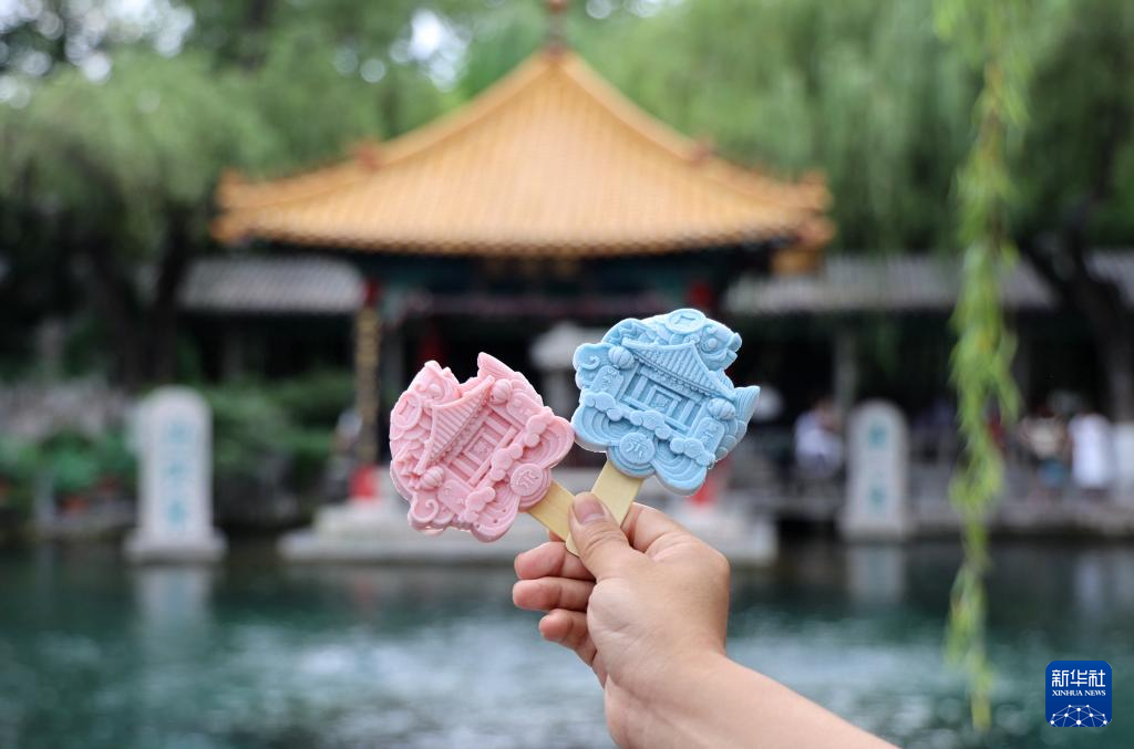 7月16日,在山东省济南市趵突泉景区,游客手持文创雪糕拍照。