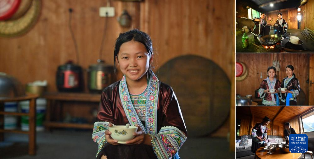拼版照片:左图为广西融水苗族自治县杆洞乡尧告村11岁的小学生韦雪菲;右图为韦雪菲跟着妈妈学习打油茶(照片均摄于7月6日)。韦雪菲说,以前都是妈妈打油茶给她喝,这个暑假她一定要学会打油茶,然后打给妈妈喝。