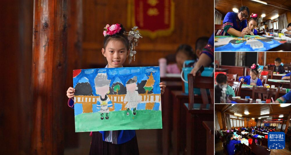 拼版照片:左图为广西三江侗族自治县8岁的小学生杨莉娜;右图为杨莉娜在县文化馆非遗公益培训班上学习侗族农民画(照片均摄于7月13日)。暑假期间,三江侗族自治县文化馆举办侗族农民画公益培训班,喜欢绘画的杨莉娜报名参加,她希望能把家乡的风雨桥、梯田、芦笙、鼓楼都画进自己的作品里。