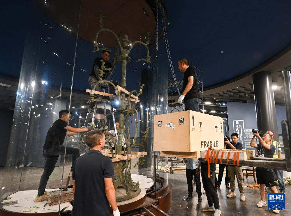 在三星堆博物馆老馆,工作人员准备将Ⅰ号大型铜神树移出玻璃罩(7月16日摄)。