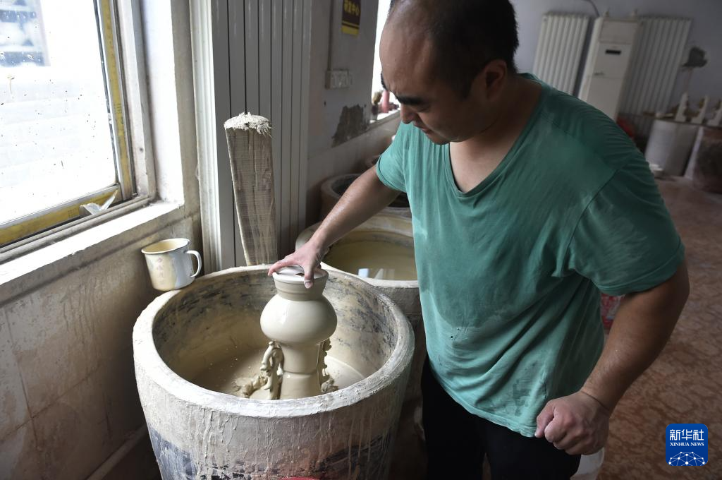 8月3日,在河南省禹州市神垕镇槐树湾村陶瓷创客基地,钧瓷艺人杨根成在自己的工作室里创作钧瓷作品。