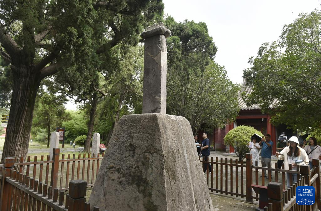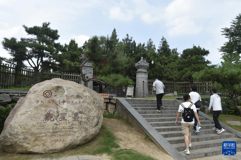 8月7日,参加集体采访活动的媒体记者参观河南登封“天地之中”历史建筑群中的观星台。