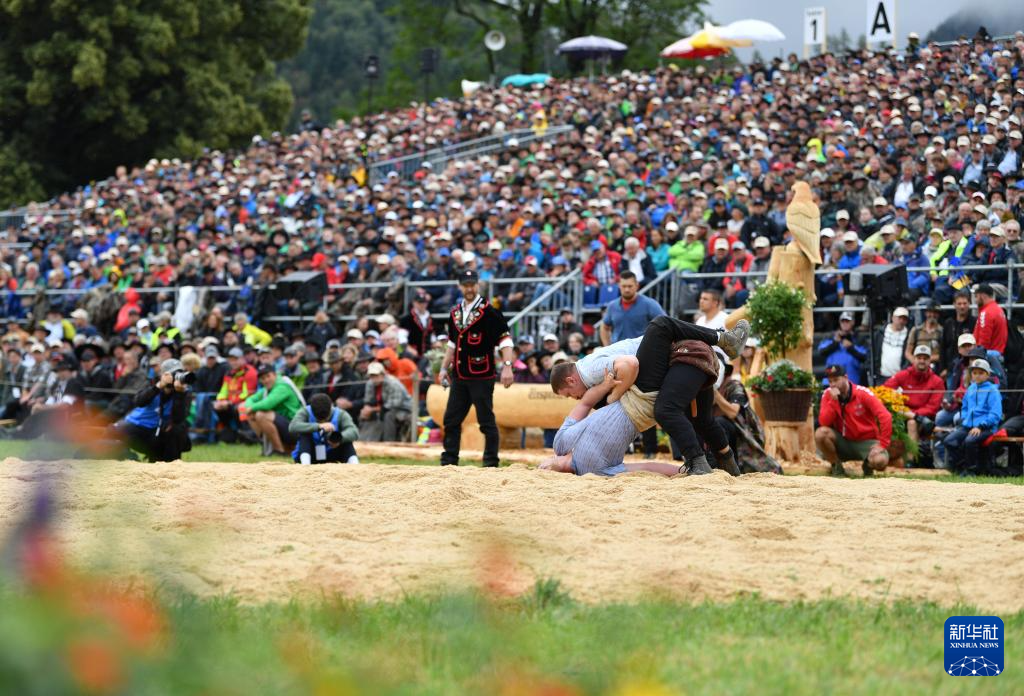 8月27日,在瑞士因特拉肯,人们在阿尔卑斯山牧羊人节上参加传统摔跤比赛。