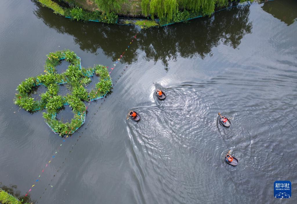 5月25日,村民们参加水乡划菱桶比赛。菱桶是河网密布的东林镇百姓家中常见的一种传统水上劳动工具,村民在捕鱼、采菱、采荷时都要用到(无人机照片)。