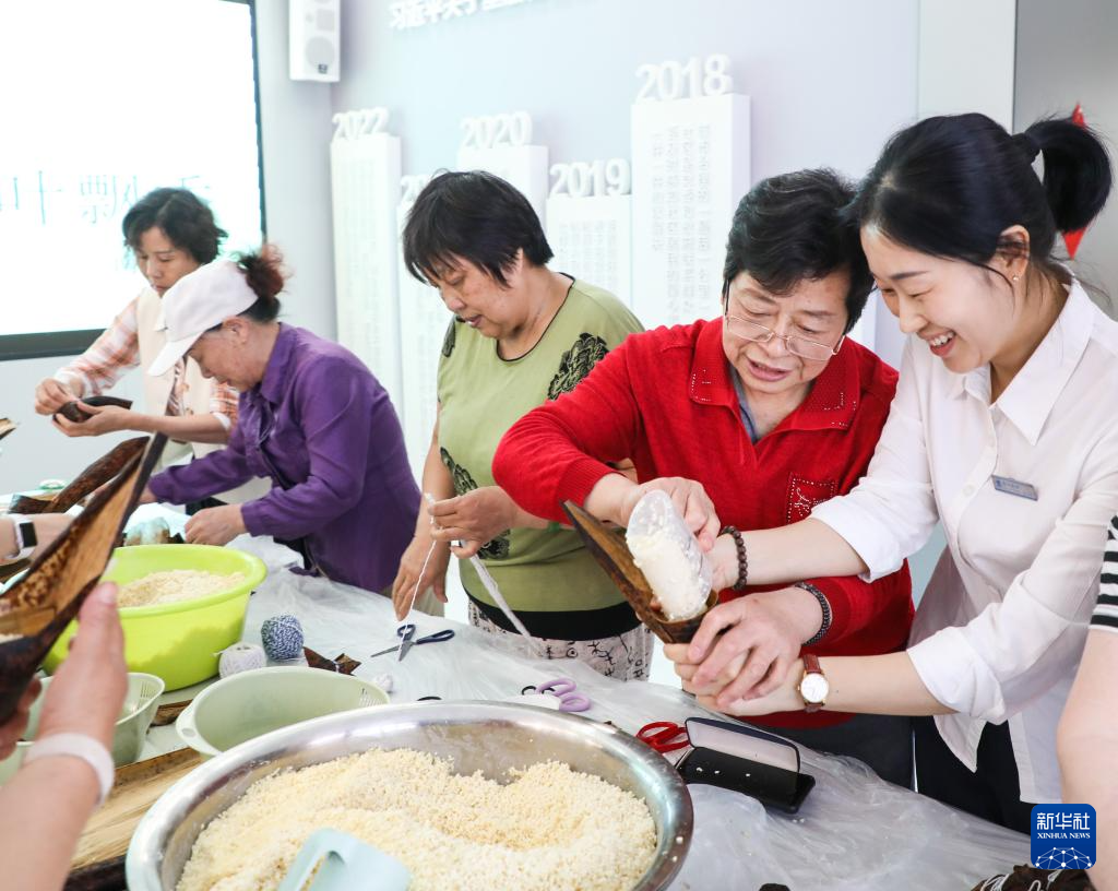 6月4日,浙江省舟山市定海区环南街道南珍社区的居民聚在一起包粽子。