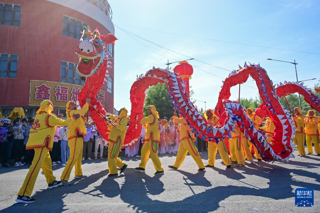 6月4日,在甘河子镇“千人共跳民族舞”主题活动现场,参演单位在进行社火舞龙表演。