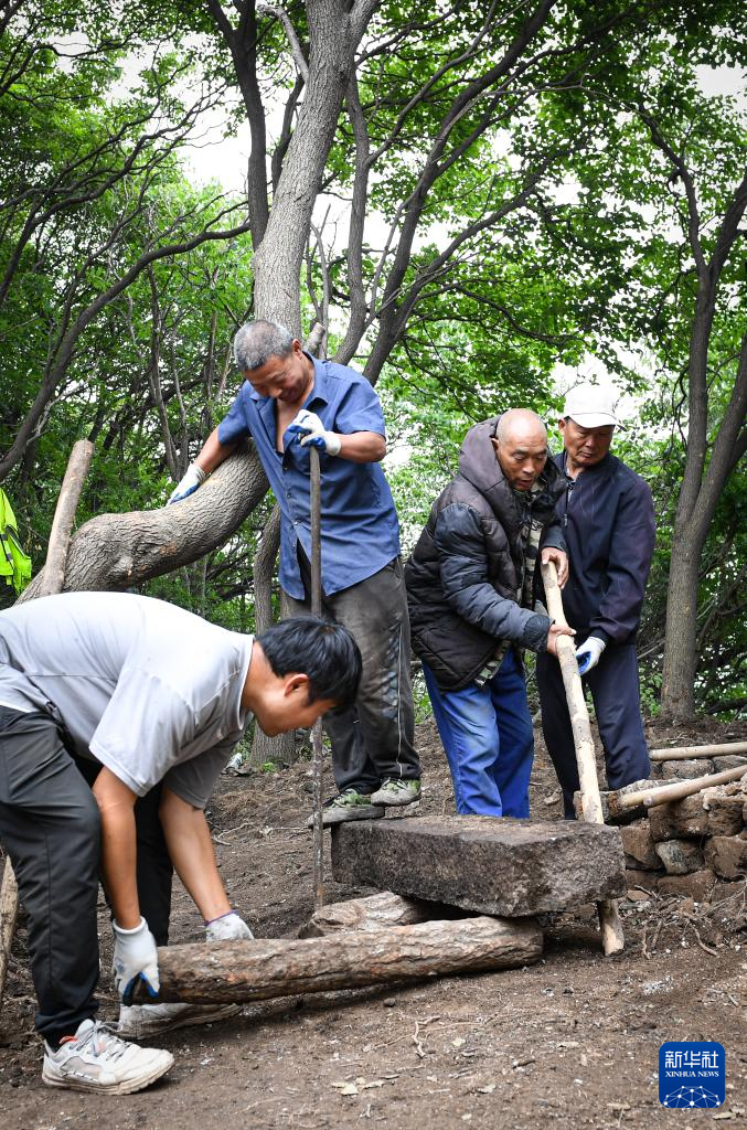 在箭扣长城120号敌台考古现场,工人们使用撬棍、滚木等工具搬运挖掘出的条石(7月2日摄)。
