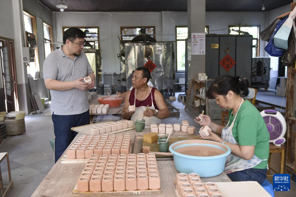 8月7日,在浙江省龙泉市的一家青瓷工作室,青瓷艺人陈华(左)在车间和施釉工人交流生产工艺。