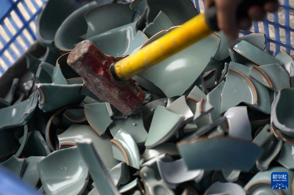 在位于江西省景德镇市善窑厂的车间里,匠人将有瑕疵的汝瓷产品敲碎(8月28日摄)。