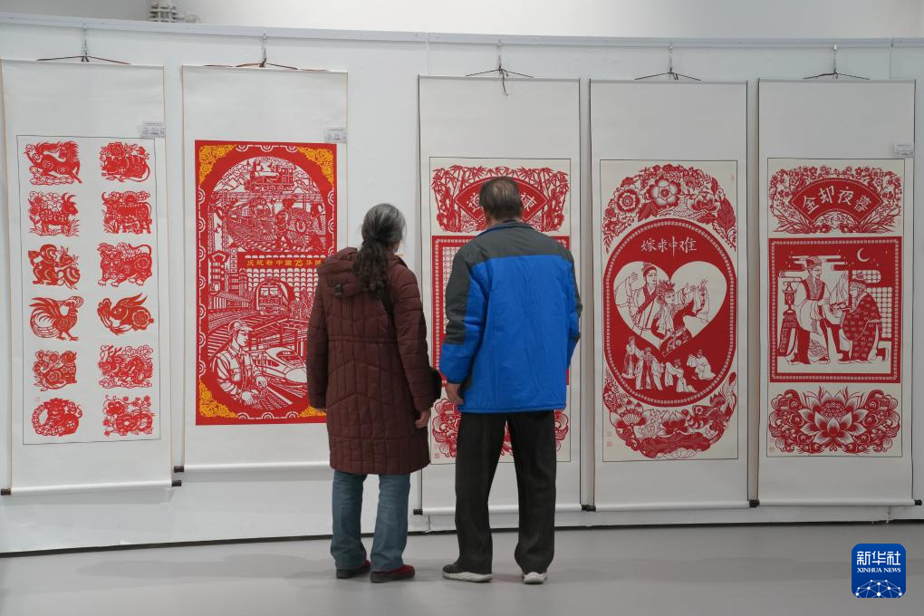 1月9日,在位于西安的陕西省文化馆内,观众参观来自陕西渭南的剪纸作品。