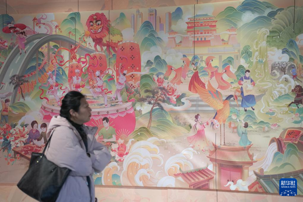 1月9日,在位于西安的陕西省文化馆内,观众参观展示陕西省代表性非遗项目的长卷插画作品。