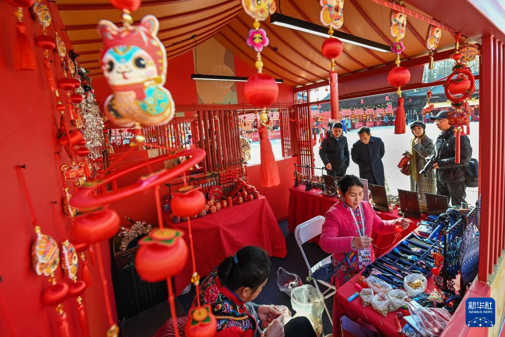 1月8日,游客在西安大唐芙蓉园内的非遗年货集市上选购重庆酉州苗绣文创产品。