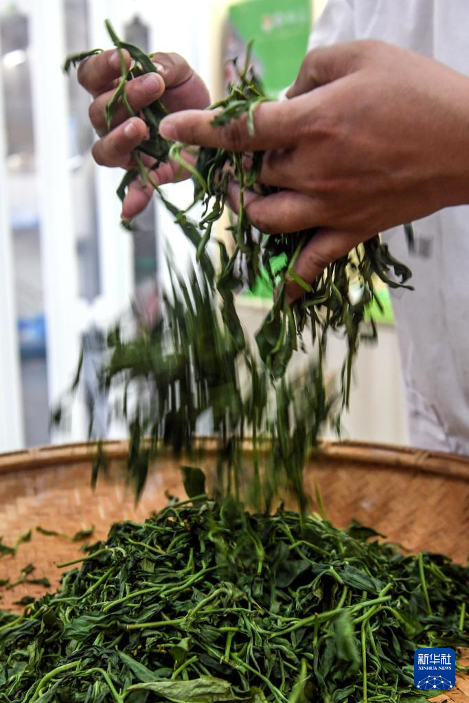 7月11日,制茶匠人在广西三江县御香茶业有限公司生产车间演示茶叶“揉捻”技艺。