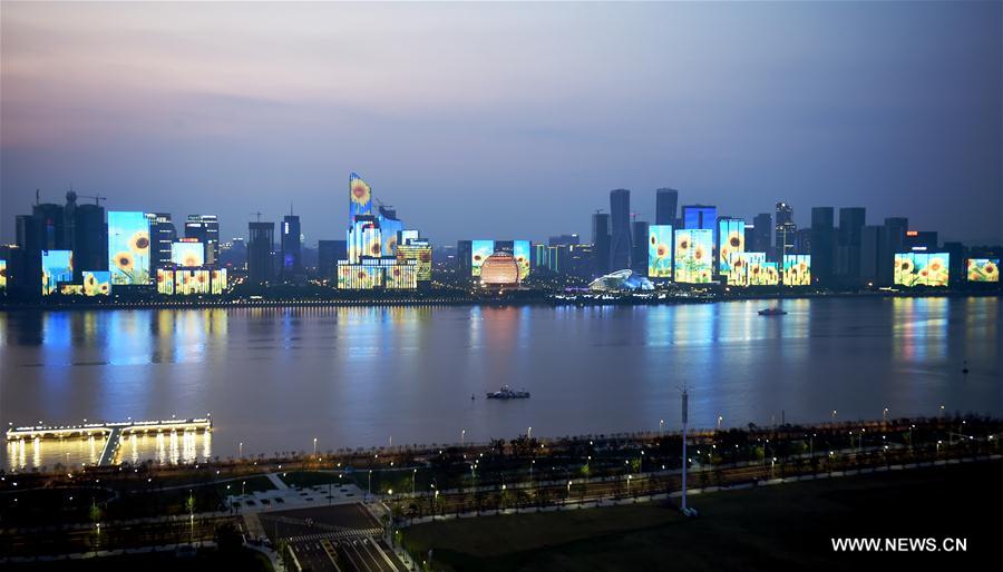 Photo taken on Sept. 2, 2016 shows a LED light show along the Qiantang River in Hangzhou, capital city of east China's Zhejiang Province. The G20 Summit will be held in Hangzhou from Sept. 4 to 5. (Xinhua/Wang Dingchang)