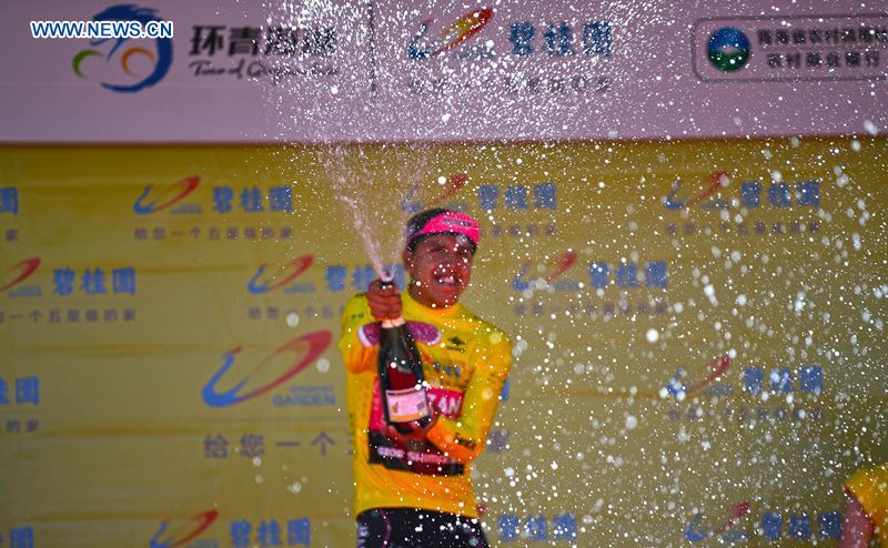 Hernan Ricardo Aguirre from Colombian Manzana Postobon Team(MZN) celebrates with the yellow jersey, at the award ceremony of the fourth stage of the Tour of Qinghai Lake in northwest China's Qinghai Province, on July 25, 2018. (Xinhuanet Photo by Yang Shoude)