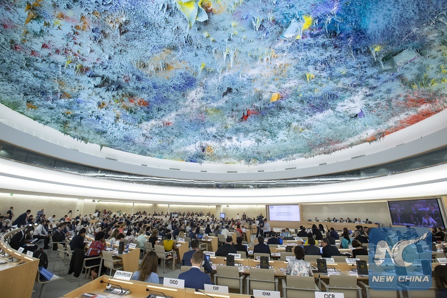 Delegates attend a plenary meeting of the UN Human Rights Council session in Geneva, Switzerland, June 22, 2019. (Xinhua/Xu Jinquan)
