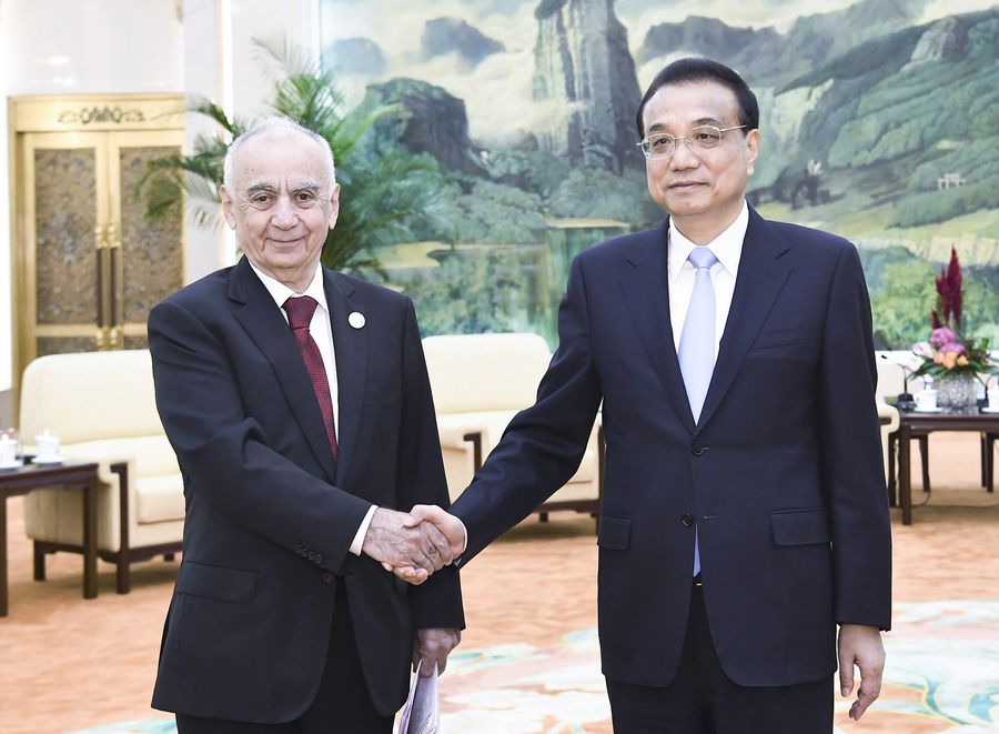 Chinese Premier Li Keqiang meets with Azerbaijani Deputy Prime Minister Hajibala Abutalybov, who is here to attend the closing ceremony of the International Horticultural Exhibition 2019 Beijing, at the Great Hall of the People in Beijing, capital of China, Oct. 9, 2019. (Xinhua/Yan Yan)