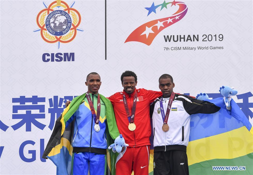 Gold medalist Shumi Leche (C) of Bahrain, silver medalist Alphonce Simbu (L) of Tanzania and bronze medalist John Hakizimana of Rwanda attend the awarding ceremony of the men's marathon individual of track and field at the 7th CISM Military World Games in Wuhan, capital of central China's Hubei Province, Oct. 27, 2019. (Xinhua/Hu Huhu)