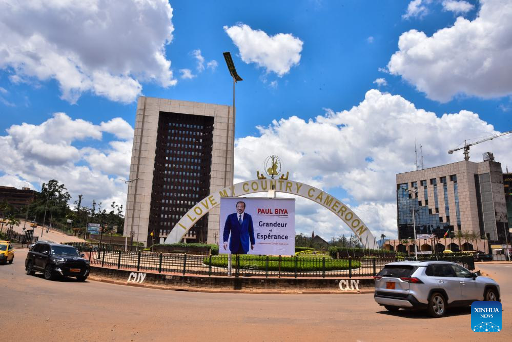 This photo taken on Sept. 27, 2025 shows a poster of incumbent President Paul Biya, leader of the ruling Cameroon People's Democratic Movement, displayed on the street in Yaounde, capital of Cameroon.