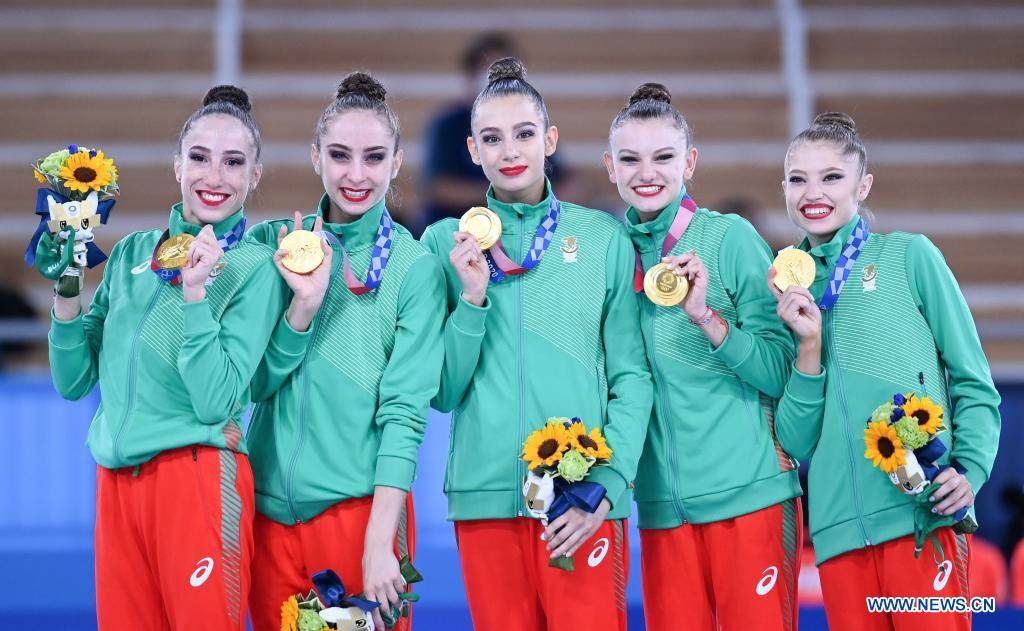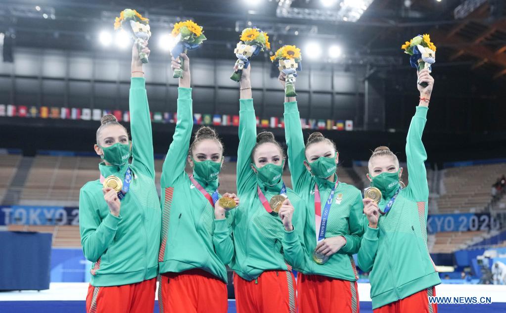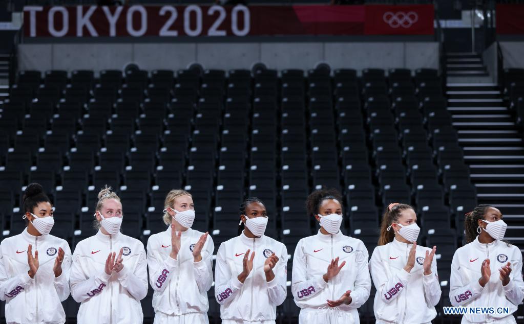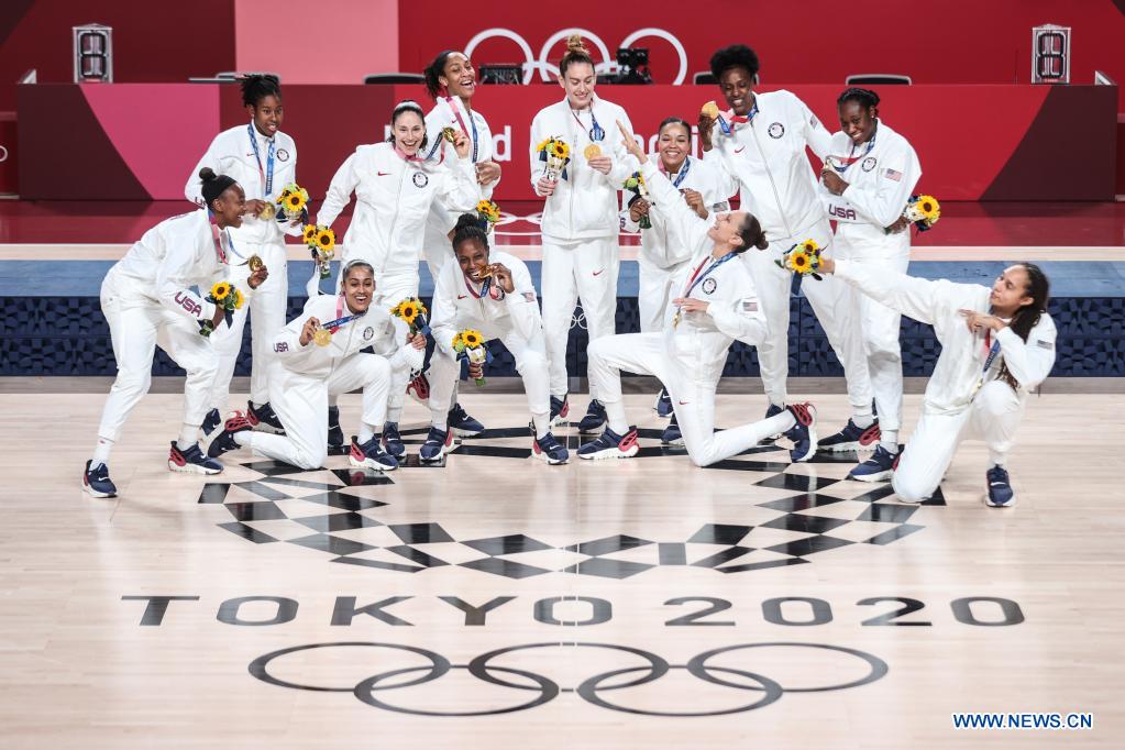 Gold medalists of Team USA pose for a photo on the women's basketball awarding ceremony at Tokyo 2020 Olympic Games, in Tokyo, Japan, Aug. 8, 2021. (Xinhua/Pan Yulong)