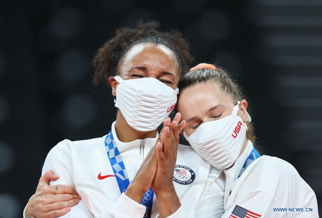 Haleigh Washington (L) of Team USA reacts on the awarding ceremony of the women's volleyball at Tokyo 2020 Olympic Games, in Tokyo, Japan, Aug. 8, 2021. (Xinhua/Ding Ting)