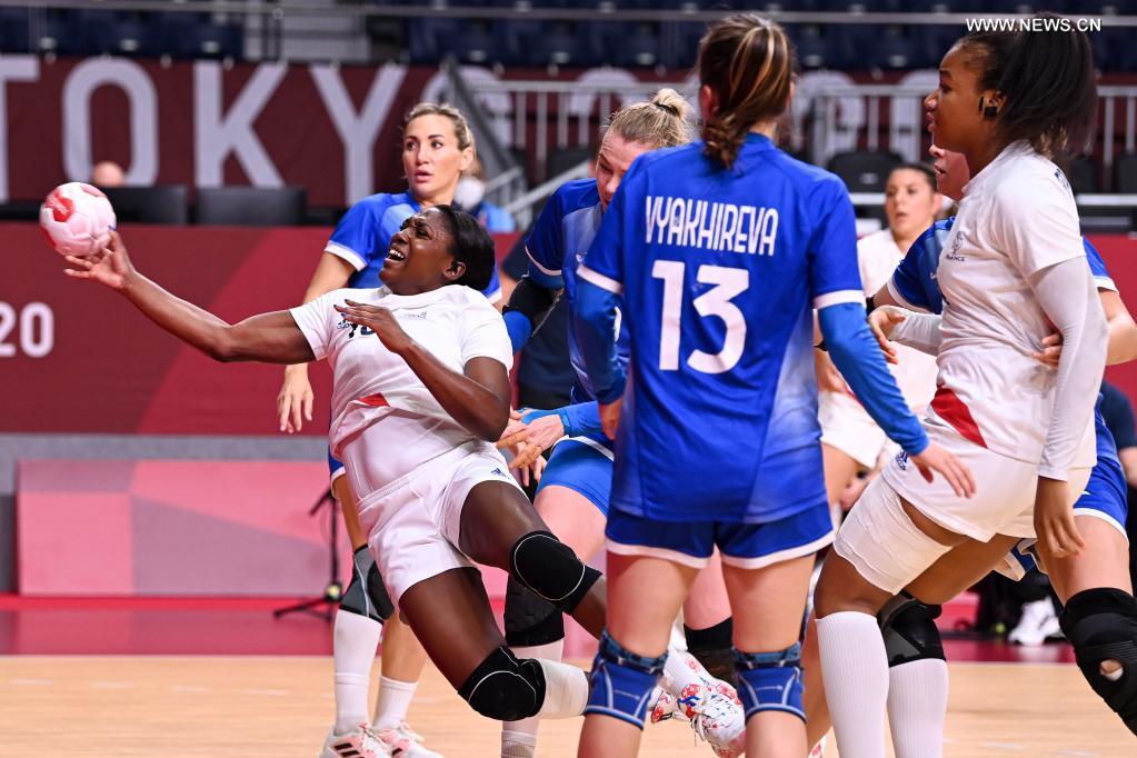 Grace Zaadi Deuna (L front) of France attacks during the women's handball gold medal match between France and ROC at Tokyo 2020 Olympic Games in Tokyo, Japan, Aug 8, 2021. (Xinhua/Du Yu)