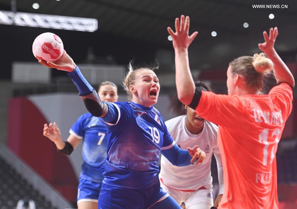 Laura Flippes (1st R) of France attacks during the women's handball gold medal match between France and ROC at Tokyo 2020 Olympic Games in Tokyo, Japan, Aug 8, 2021. (Xinhua/Du Yu)
