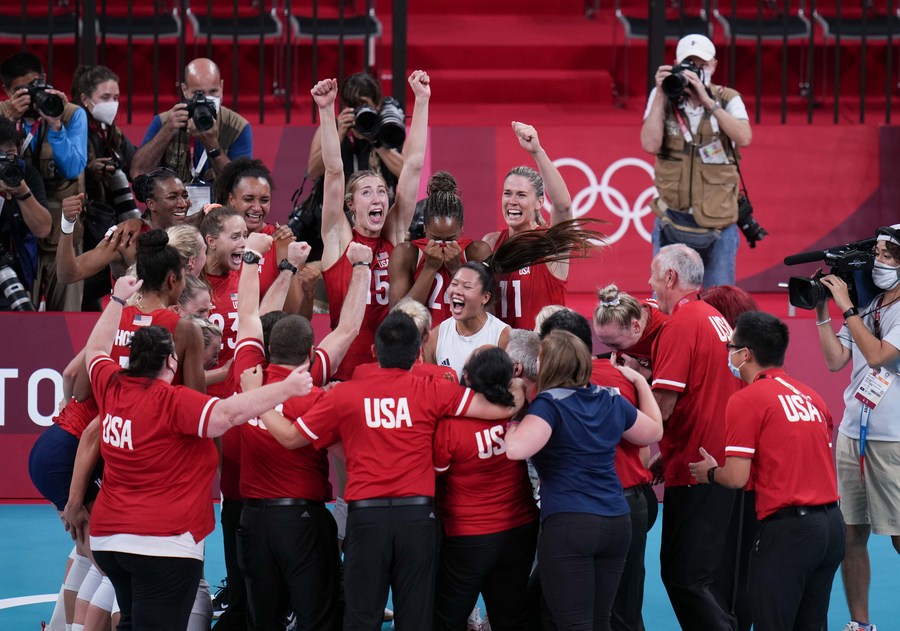Members of Team USA celebrate after winning the women's volleyball final against Brazil at Tokyo 2020 on Aug. 8, 2021. (Xinhua/Xu Zijian)