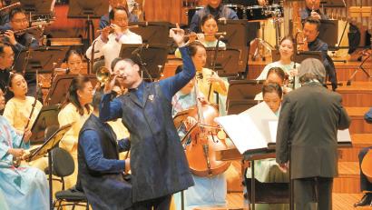 下半场演出中,五重奏与乐队《卉木拾音》以婉转细腻的微观视角展现大国工匠精神;二胡与乐队《查尔达什》改编自同名小提琴曲,吸收匈牙利吉普赛民间舞曲音乐元素;民族管弦乐《丝绸之路》融合多元文化风情;民族管弦乐《共同家园》奏响携手共建地球家园的主题。民乐组合与乐队《蜂飞》改编自俄罗斯作曲大师里姆斯基-科萨科夫的经典之作,打击乐演奏家王音睿的恣意洒脱,让观众席毫无意外地又一次沸腾。