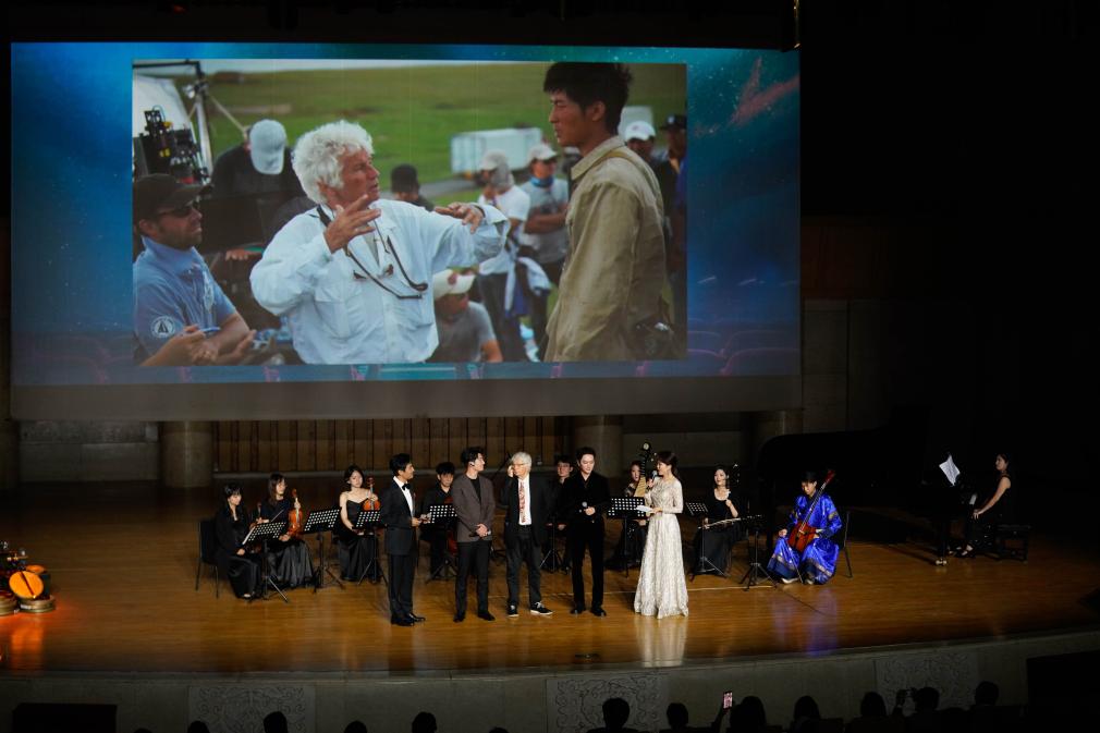 9月22日,电影《狼图腾》导演让·雅克·阿诺(前排左二)与演员冯绍峰(前排右二)、窦骁(前排左一)在音乐会上互动。新华社记者 谢晗 摄