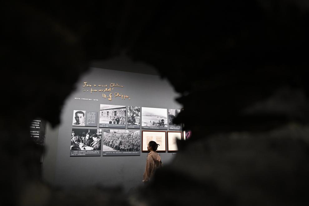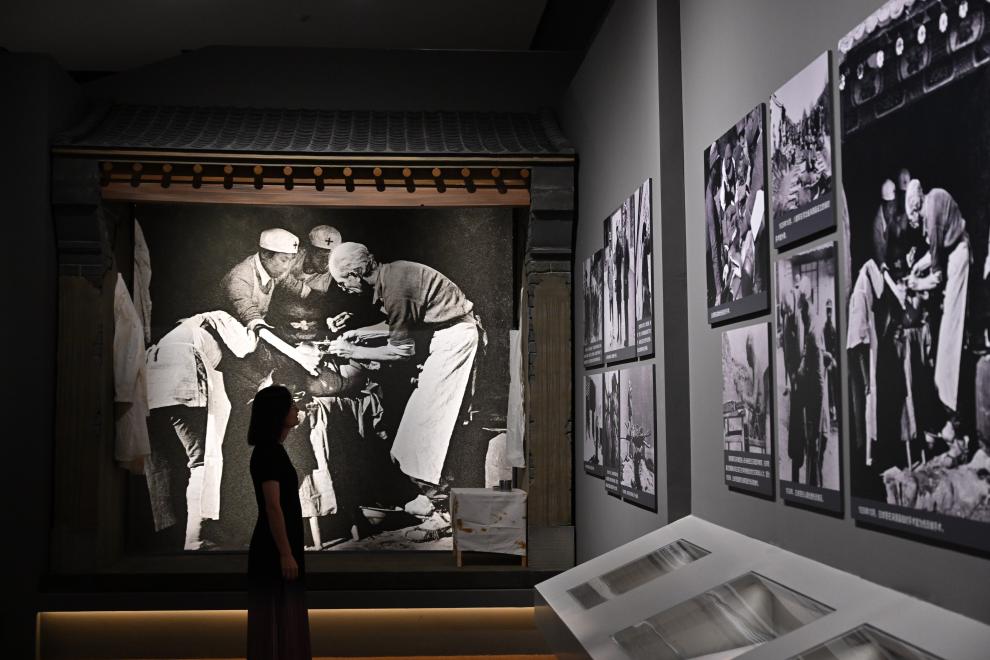 9月7日,在中国国家博物馆,一名媒体人员在参观白求恩的照片。