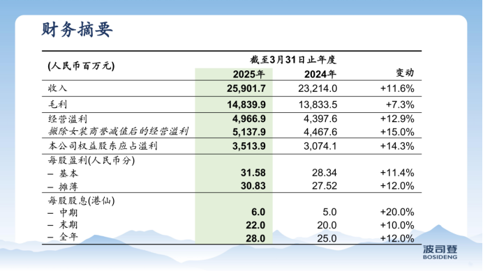 业绩的稳健增长离不开公司近年来持续聚焦主业的发展战略,2018 年以来,波司登重新聚焦主航道与主品牌,实现品牌的再次腾飞。24/25财年,波司登锚定“聚焦羽绒服主航道、聚焦时尚功能科技服饰主赛道”的“双聚焦”战略方向,波司登收入提升11.6%至约人民币259.02亿元,实现了稳中有进的发展目标;净利润高速提升13.9%至约人民币35.53亿元,营收和净利润连续8年创同期历史新高。其中经营溢利增速再次快于收入增速,企业经营效率提升,经营溢利提升12.90%。