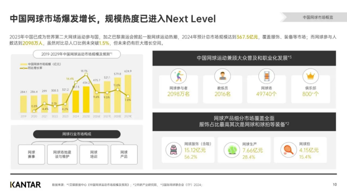 艾媒数据预测,预计2029年我国网球运动市场规模将达624.9亿元。其中,网球服饰(含鞋)占据较大市场份额,2023年国内相关销售额约15.1亿元,占比56%。
