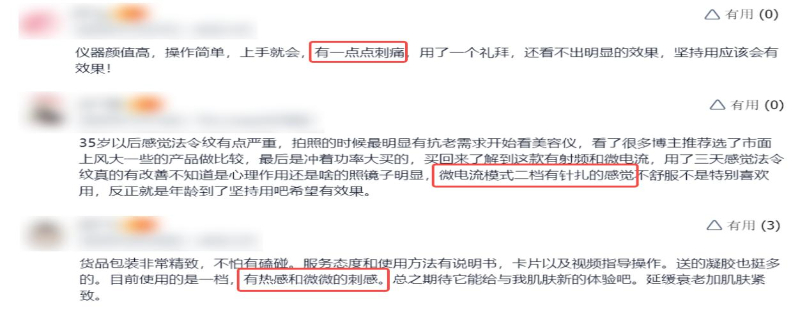 从用户真实评价可见,肤感问题成为美容仪推广与留存的突出痛点。部分美容仪操作时会带来 “刺痛”“针扎感”“微微刺感” 等不适体验。这类问题不仅降低使用舒适度,还易引发消费者对产品安全性、肤质适配性的顾虑,甚至影响长期使用意愿。
