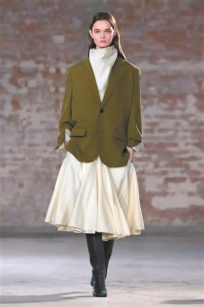 记者留意到,本季的迷笛半裙、新A字裙在国际秀场上备受品牌设计师的宠爱。据POP趋势网2025年Q3监测数据,多元风格融合设计的女装产品销售额同比增长38%,65%消费者更倾向选择具有多种风格元素的服装。其中,迷笛半裙、牛仔裙等复古单品通过开衩设计、材质混纺等迎来新一波热度。