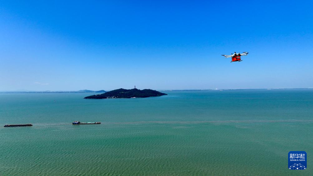 8月19日,安徽省合肥市巢湖上空,无人机在配送快递包裹(无人机照片)。