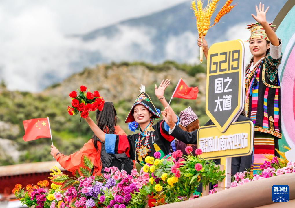 8月21日上午,西藏各族各界干部群众约2万人欢聚拉萨市布达拉宫广场,热烈庆祝西藏自治区成立60周年。这是彩车上的演员通过布达拉宫广场时向人群挥手。