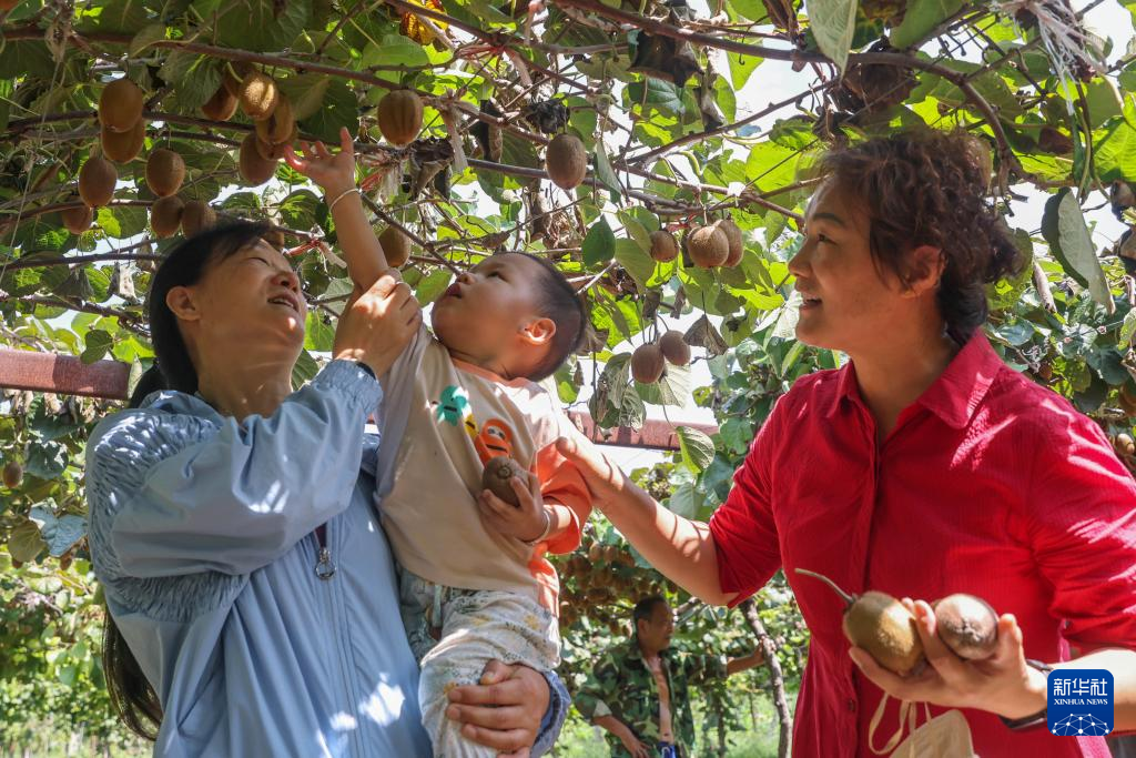 8月31日,游客在河南省平顶山市宝丰县闹店镇小张庄村一家猕猴桃种植园采摘。