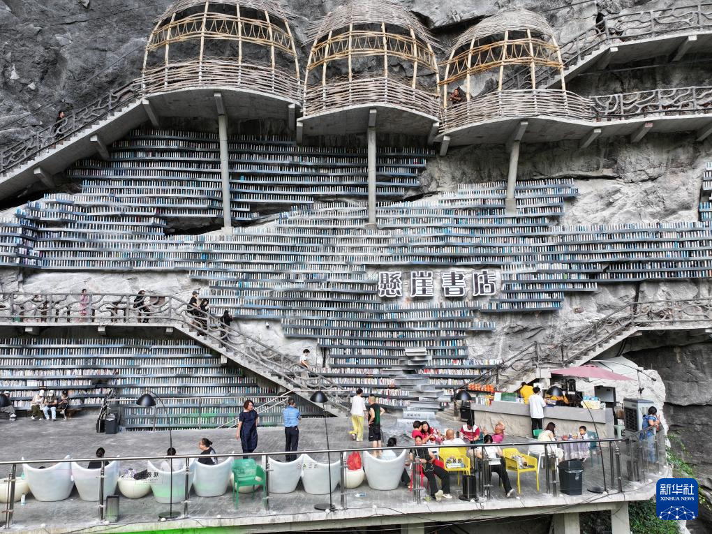 8月30日,游客在广西河池市罗城仫佬族自治县悬崖书店游玩(无人机照片)。